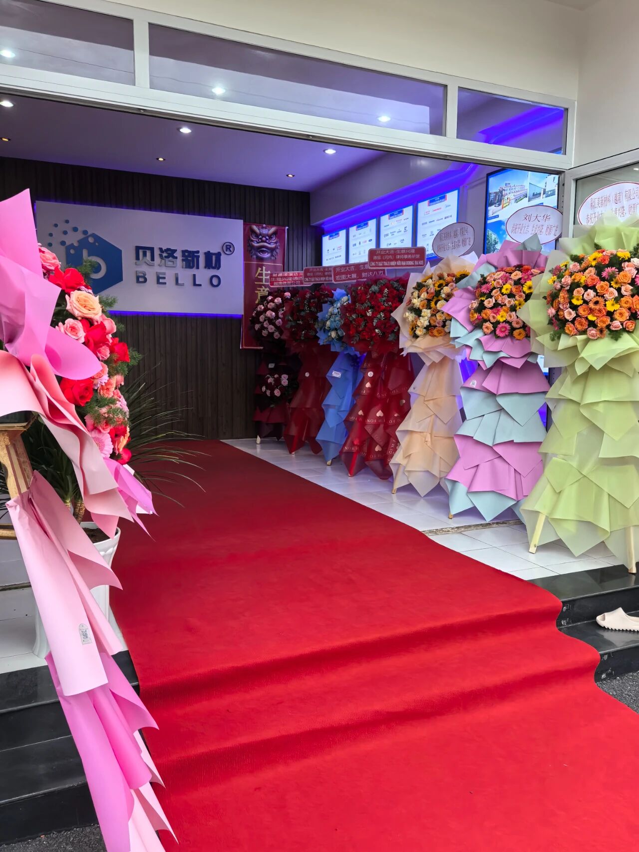开业庆典仪式开始前 南瓜高清播放,花篮锦簇,众多的花篮也是代表着兄弟公司与合作伙伴对贝洛的美好祝福,现场洋溢着喜庆的氛围。