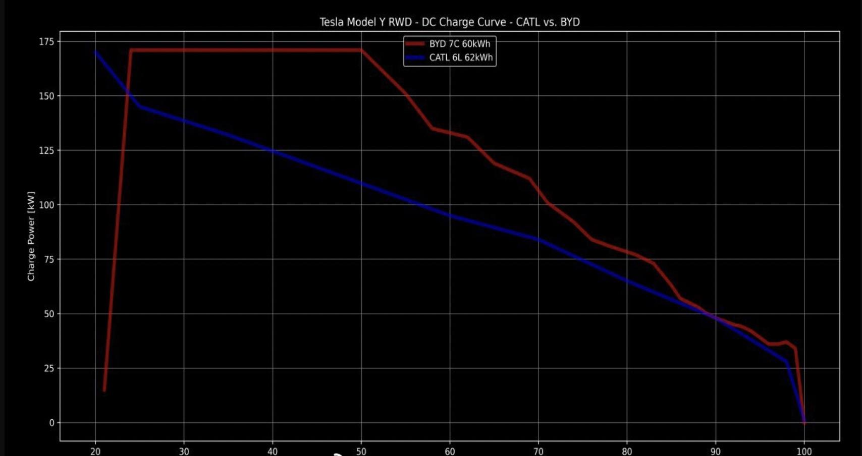 有用户分享了这款车型的实测充电功率数据,刀片电池版本的Model Y充电峰值功率达到170kW以上,15分钟就能从11%充至71%,对比宁德时代版本,可以看到比亚迪版本的高功率充电时间维持的更长 南瓜影院在线观看,充电功率也比较高。