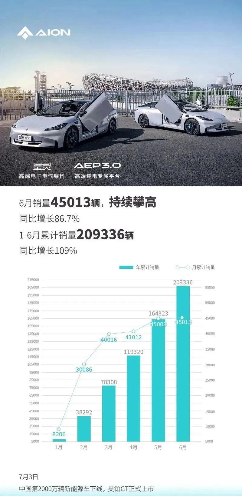 广汽埃安公布最新销量成绩。2023年6月销量45013辆,同比增长86,7%。2023年1-6月累计销量209336辆,同比增长109%。 南瓜高清播放。