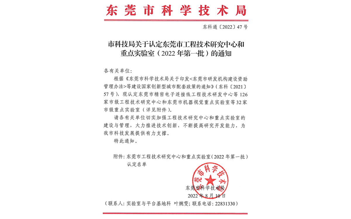 2023-02-10 18:02:55由东莞市科学技术局2022年8月10日颁发东科通(2022)47号文件,市科技局关于认定东莞市工程技术研究中心和重点实验室( 2022年第一批)的通知,南瓜影院荣获“东莞市(贝洛)橡胶高分子材料工程技术研究中心”。