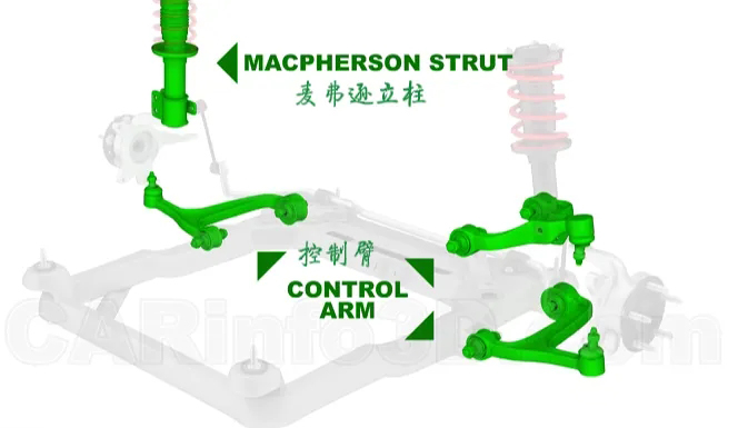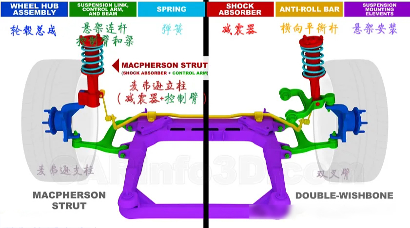 独立悬架中最典型的是麦弗逊悬架和双叉臂悬架。