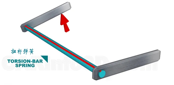 扭杆弹簧是一根可以扭转的金属棒,使用时一端固定在车架上,另外一端与控制臂相连,当车轮经过障碍物后,扭杆弹簧储存的弹性势能使控制臂和车轮迅速回位。