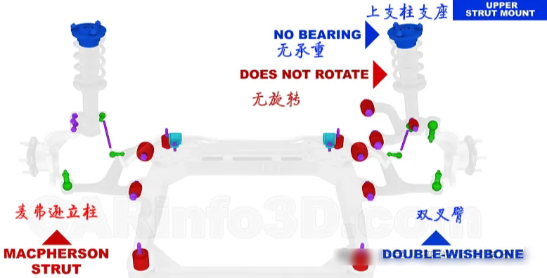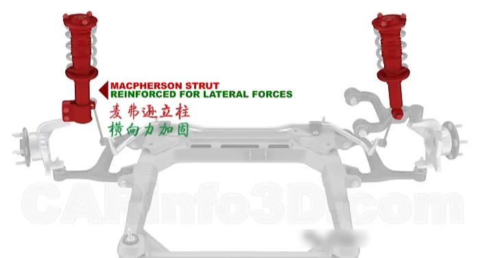 当然在双叉臂悬架中,减震器无需随控制臂转动,只承受纵向载荷,因此横向刚度大,操控性强。