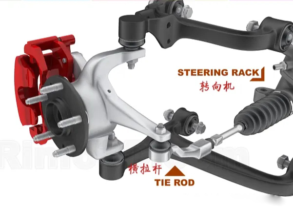 转向节除与控制臂连接,还与横拉杆相连,此外,制动钳(红色)也是安装在转向节上的 南瓜影院。