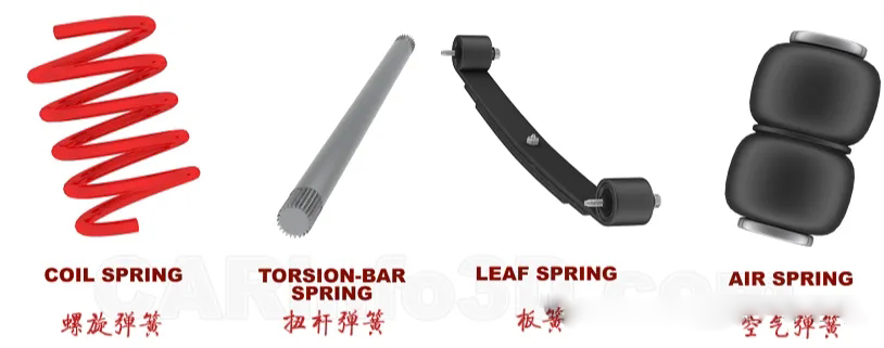 汽车悬架系统中用的弹簧主要有四种:螺旋弹簧、扭杆弹簧、板簧和空气弹簧。