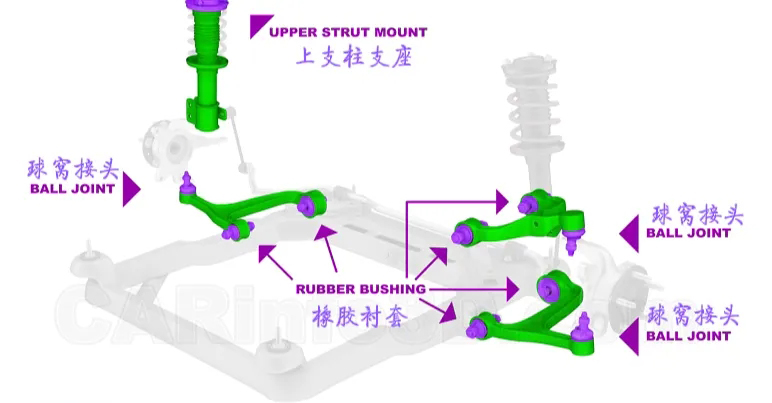 此外,悬架系统的安装也需借助多种元件,如橡胶衬套、球窝接头等,以实现各部件之间的柔性连接和灵活运动。