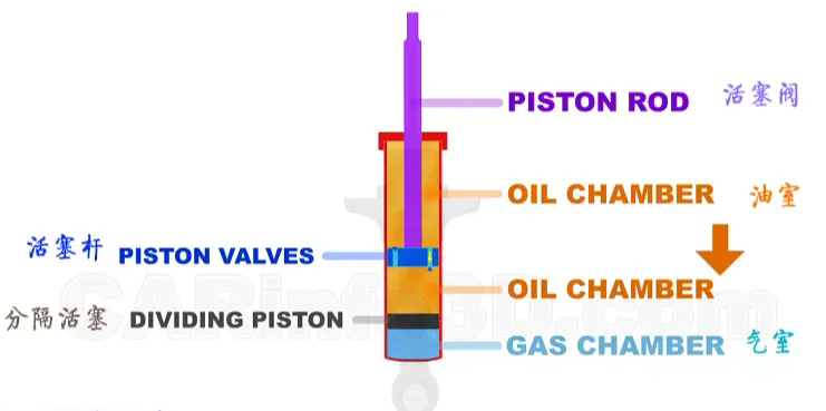 减震器由活塞阀、油室、活塞杆、分隔活塞和气室构成。