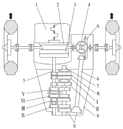 1—发动机. 2—从动盘. 3—离合器模块. 4—差速器. 5—驱动轴(主轴). 6—带边轴的主动齿轮. 7—从动轴. 8—手动变速器. Ⅰ—第1挡. Ⅱ—第2挡. Ⅲ—第3挡 南瓜影院. Ⅳ—第4挡. Ⅴ—第5挡. Ⅵ—第6挡. R—倒车挡. A—主减速器. S—中间传动的圆柱齿轮.