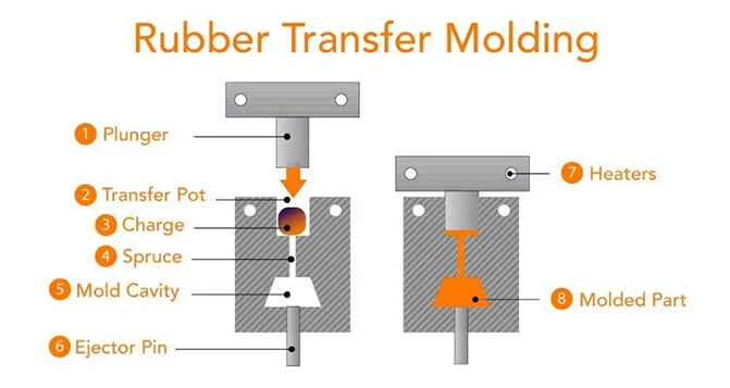 工艺步骤:橡胶料置于转注室 南瓜影院在线观看,经由柱塞或活塞加压挤入模腔,随后硫化成型。