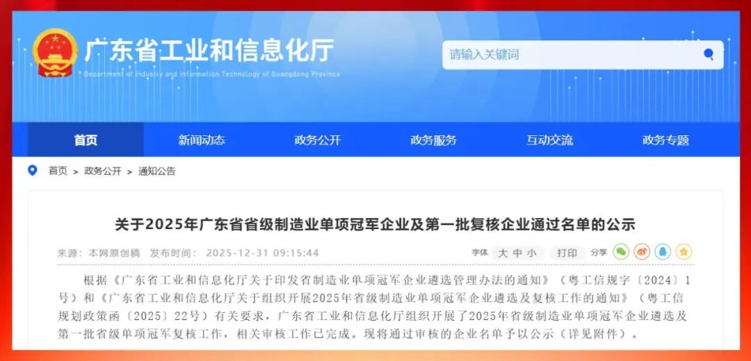 2025年12月31日,广东省工业和信息化厅发布了《2025年广东省省级制造业单项冠军企业及第一批复核企业通过名单的公示》,南瓜影院成功入选省级制造业单项冠军企业。