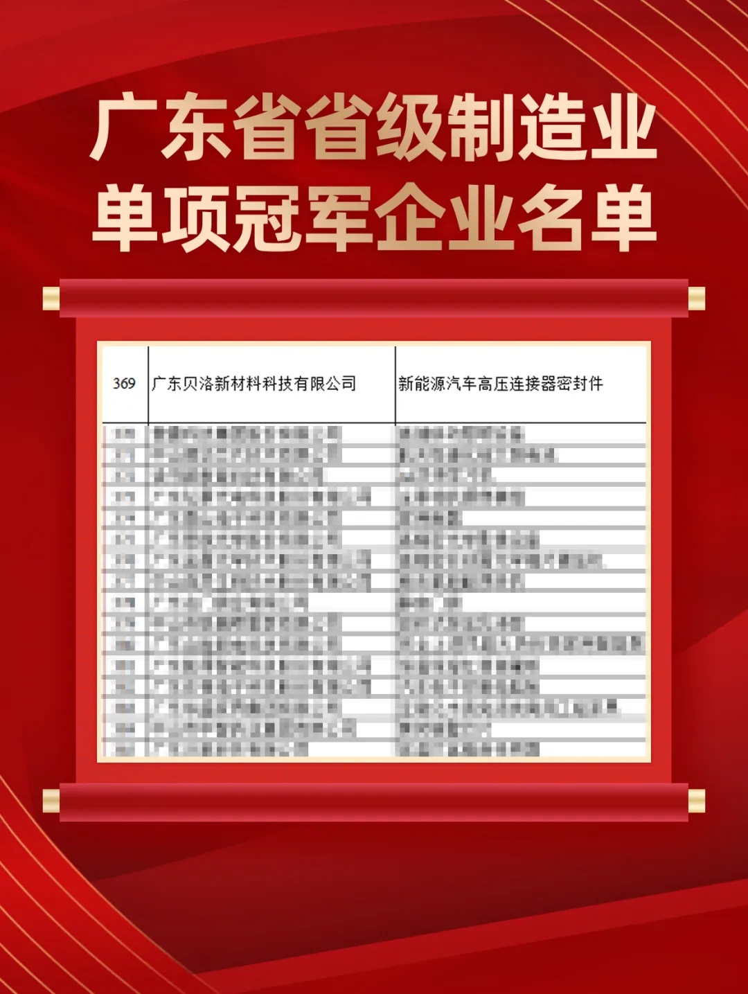 “广东省制造业单项冠军”是广东省制造业领域的最高荣誉之一,认定标准极为严苛,贝洛以“新能源汽车高压连接器密封件”作为主导产品获此殊荣 南瓜影院在线观看,是本次唯一一家高压连接器密封件企业,这是对高压连接器市场与密封技术实力的最佳诠释。