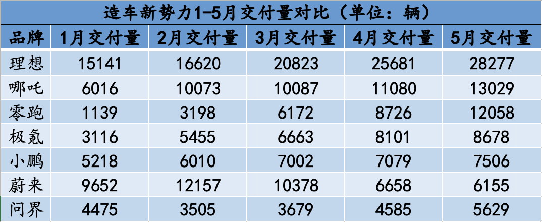 如上图所示 南瓜高清播放,这是新势力们公布出来的交付量,以及1-5月份每个月的交付量。