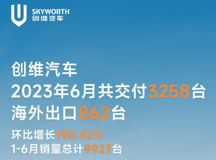 创维汽车6月共交付新车3,258辆,海外出口862辆,环比增长190.42%。1-6月销量总计9,927辆,相对于今年全年4万辆的目标,完成度为25%。